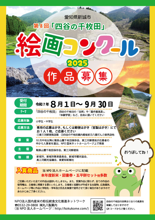 | 審 査: | 10月中旬以降に鞍掛山麓千枚田保存会、東三河郵便局が応募者の中から入賞者を選出 |